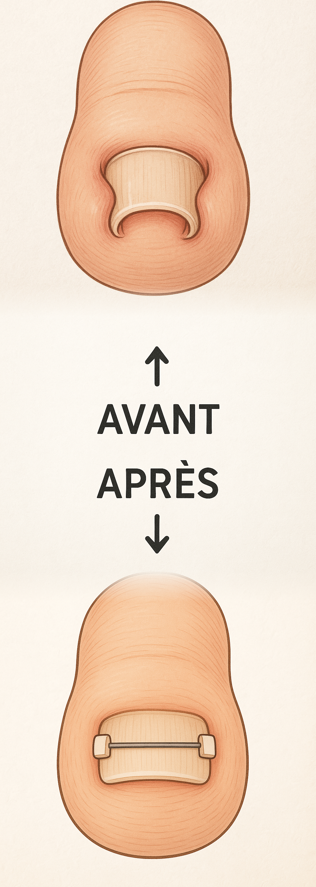 Pour éviter cela, on pose un fil en titane fixé par deux petits plots en résine directement sur l’ongle. Ce fil exerce une tension légère et constante qui va redresser progressivement l’ongle au fil de sa repousse.